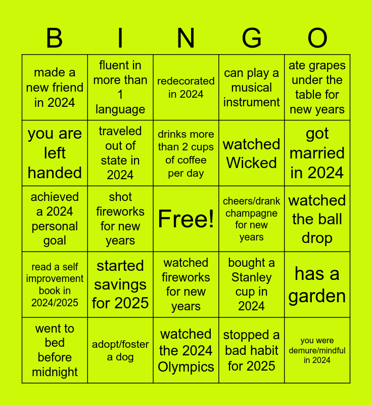 This bingo card has a free space and 29 words: went to bed before midnight, moved in 2024, shot fireworks for new years, created a 2025 goal, made a new friend in 2024, redecorated in 2024, traveled out of state in 2024, started savings for 2025, cheers/drank champagne for new years, adopt/foster a dog, watched the ball drop, you were demure/mindful in 2024, watched the 2024 Olympics, stopped a bad habit for 2025, got married in 2024, added a new 2025 podcast, watched fireworks for new years, read a self improvement book in 2024/2025, ate grapes under the table for new years, achieved a 2024 personal goal, bought a Stanley cup in 2024, own a pet that is not a dog/cat, watched Wicked, you are left handed, can play a musical instrument, fluent in more than 1 language, has a garden, drinks more than 2 cups of coffee per day and joined a fantasy football league.