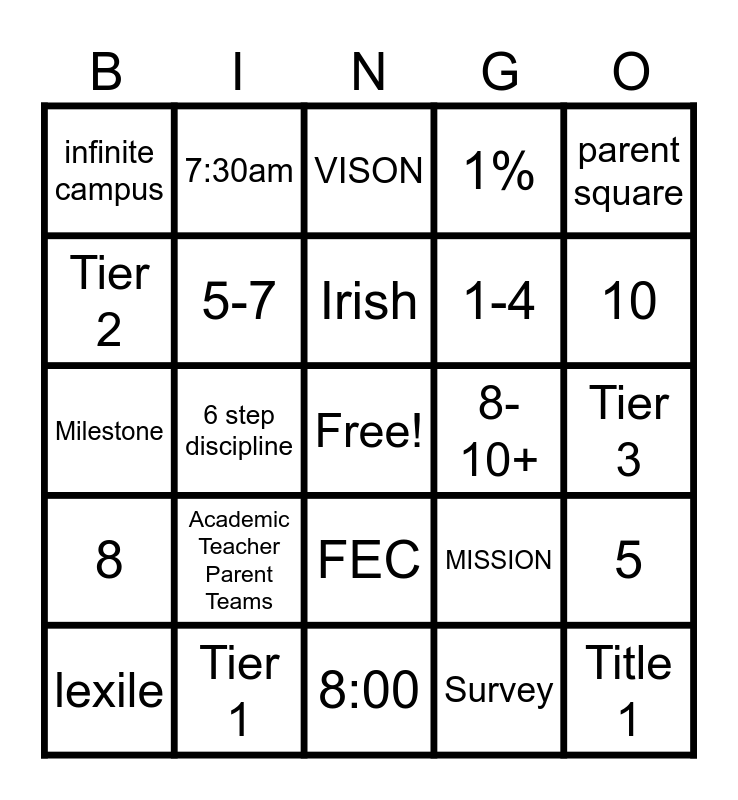 This bingo card has a free space and 24 words: Academic Teacher Parent Teams, Tier 1, Irish, lexile, parent square, infinite campus, Tier 2, 7:30am, 8-10+, FEC, 1-4, Milestone, MISSION, 5, 5-7, Survey, Tier 3, VISON, 10, 6 step discipline, Title 1, 8, 1% and 8:00.