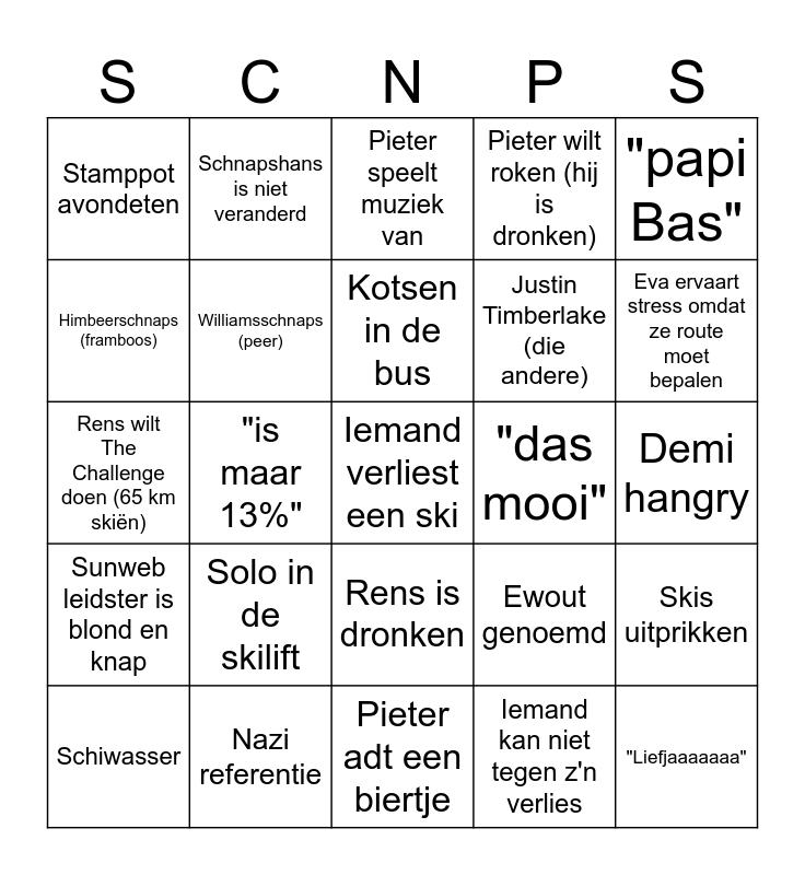 This bingo card has 53 words: Free!, Iemand verliest een ski, Iemand janken, Iemand kan niet tegen z'n verlies, Solo in de skilift, Vast in de skilift, Schnapshans is niet veranderd, "SIIIIUUUUUUUUUUUU", Himbeerschnaps (framboos), Marilleschnaps (abrikoos), Williamsschnaps (peer), Jägerbomb, Skis uitprikken, Ewout genoemd, Satisfyer genoemd, Schiwasser, Kotsen in de bus, "das mooi", "Koning Rik", "papi Bas", "is maar 13%", "Liefjaaaaaaa", Justin Timberlake (die andere), Stamppot avondeten, Fotomomentje op de piste, Nazi referentie, Bedankt witte man opmerking van PFR, Eva/Demi zegt iets heel doms, Eva vindt een mentaal probleem conceptueel heel ingewikkeld, Eva ervaart stress omdat ze route moet bepalen, Eva doet partytrick, Eva valt in slaap, Maartje moet Demi's haar vlechten, Maartje bestelt portie kaiserschmarren voor zichzelf, Maartje heeft spijt van de kaiserschmarren (het is te veel), Maartje vindt dat het lang duurt, Pieter wilt roken (hij is dronken), Pieter adt een biertje, Pieter speelt muziek van, Pieter flirt met cougar, Demi chagrijnig (service niet naar wens), Demi gaat shoppen, Demi hangry, Demi spijt van haar bestelde gerecht, Demi/Maartje kieskeurige eter bij avondeten beslissen, Rens is dronken, Rens bepaalt de route, Rens wilt Guus in de wachtrij, Rens wilt The Challenge doen (65 km skiën), Sunweb leidster is blond en knap, Iemand probeert Duits maar de Duitser verstaat het niet, Handschoen/stok uit de lift laten vallen and Iemand bestelt dubbel bij lunch.