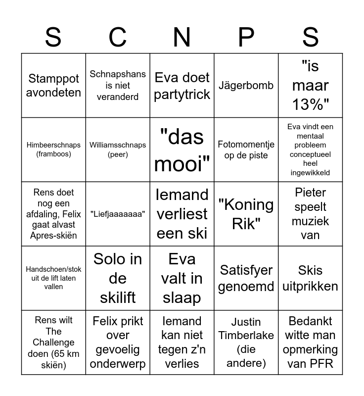 This bingo card has 50 words: Free!, Iemand verliest een ski, Iemand janken, Iemand kan niet tegen z'n verlies, Solo in de skilift, Vast in de skilift, Schnapshans is niet veranderd, "SIIIIUUUUUUUUUUUU", Himbeerschnaps (framboos), Marilleschnaps (abrikoos), Williamsschnaps (peer), Jägerbomb, Skis uitprikken, Satisfyer genoemd, Schiwasser, Kotsen in de bus, "das mooi", "Koning Rik", "papi Bas", "is maar 13%", "Liefjaaaaaaa", Justin Timberlake (die andere), Stamppot avondeten, Fotomomentje op de piste, Nazi referentie, Bedankt witte man opmerking van PFR, Eva vindt een mentaal probleem conceptueel heel ingewikkeld, Eva ervaart stress omdat ze route moet bepalen, Eva doet partytrick, Eva valt in slaap, Maartje bestelt portie kaiserschmarren voor zichzelf, Maartje heeft spijt van de kaiserschmarren (het is te veel), Maartje vindt dat het lang duurt, Maartje en Felix doen klef, Felix prikt over gevoelig onderwerp, Felix vergeet iets belangrijks, Felix is dronken, Pieter wilt roken (hij is dronken), Pieter adt een biertje, Pieter speelt muziek van, Pieter flirt met cougar, Rens is dronken, Rens bepaalt de route, Rens wilt Guus in de wachtrij, Rens wilt The Challenge doen (65 km skiën), Rens doet nog een afdaling, Felix gaat alvast Apres-skiën, Sunweb leidster is blond en knap, Iemand probeert Duits maar de Duitser verstaat het niet, Handschoen/stok uit de lift laten vallen and Iemand bestelt dubbel bij lunch.