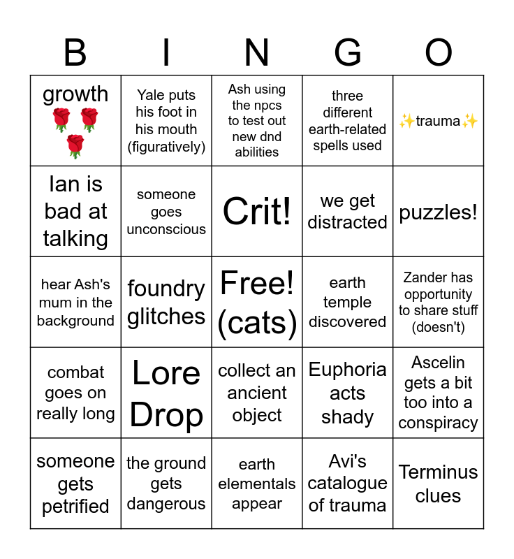 This bingo card has a free space and 24 words: Lore Drop, the ground gets dangerous, Crit!, someone gets petrified, ✨trauma✨, growth 🌹🌹🌹, Ian is bad at talking, Yale puts his foot in his mouth (figuratively), earth temple discovered, collect an ancient object, we get distracted, hear Ash's mum in the background, Euphoria acts shady, Ascelin gets a bit too into a conspiracy, someone goes unconscious, Avi's catalogue of trauma, Zander has opportunity to share stuff (doesn't), Ash using the npcs to test out new dnd abilities, puzzles!, foundry glitches, Terminus clues, combat goes on really long, three different earth-related spells used and earth elementals appear.