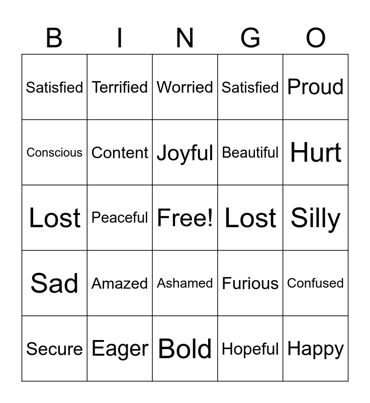 This bingo card has a free space and 24 words: Amazed, Eager, Joyful, Secure, Proud, Satisfied, Conscious, Terrified, Lost, Ashamed, Beautiful, Lost, Furious, Confused, Content, Hopeful, Silly, Worried, Hurt, Peaceful, Happy, Sad, Satisfied and Bold.