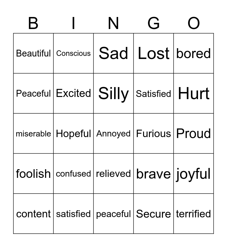 This bingo card has 51 words: Amazed, Eager, Joyful, Secure, Proud, Angry, Conscious, Terrified, Lost, Ashamed, Beautiful, Excited, Annoyed, Furious, Confused, Content, Hopeful, Silly, Worried, Hurt, Peaceful, Happy, Sad, Satisfied, Bold, content, confused, comfortable, brave, bored, bold, hurt, hopeful, furious, frustrated, foolish, excited, peaceful, overwhelmed, motivated, miserable, worried, wistful, uncomfortable, terrified, sad, satisfied, relieved, proud, joyful and jealous.