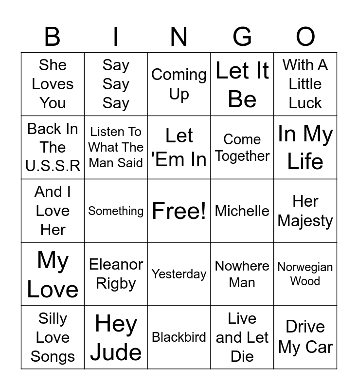 This bingo card has a free space and 34 words: Band On The Run, Live and Let Die, Jet, Maybe I'm Amazed, My Love, Listen To What The Man Said, With A Little Luck, Silly Love Songs, Say Say Say, Ebony & Ivory, Let 'Em In, Coming Up, Hello, Goodbye, Yellow Submarine, Michelle, In My Life, Hey Jude, And I Love Her, Eleanor Rigby, Nowhere Man, Yesterday, Help, She Loves You, Her Majesty, Blackbird, Drive My Car, Let It Be, Strawberry Fields Forever, Come Together, Back In The U.S.S.R, I Will, Something, Norwegian Wood and Twist & Shout.