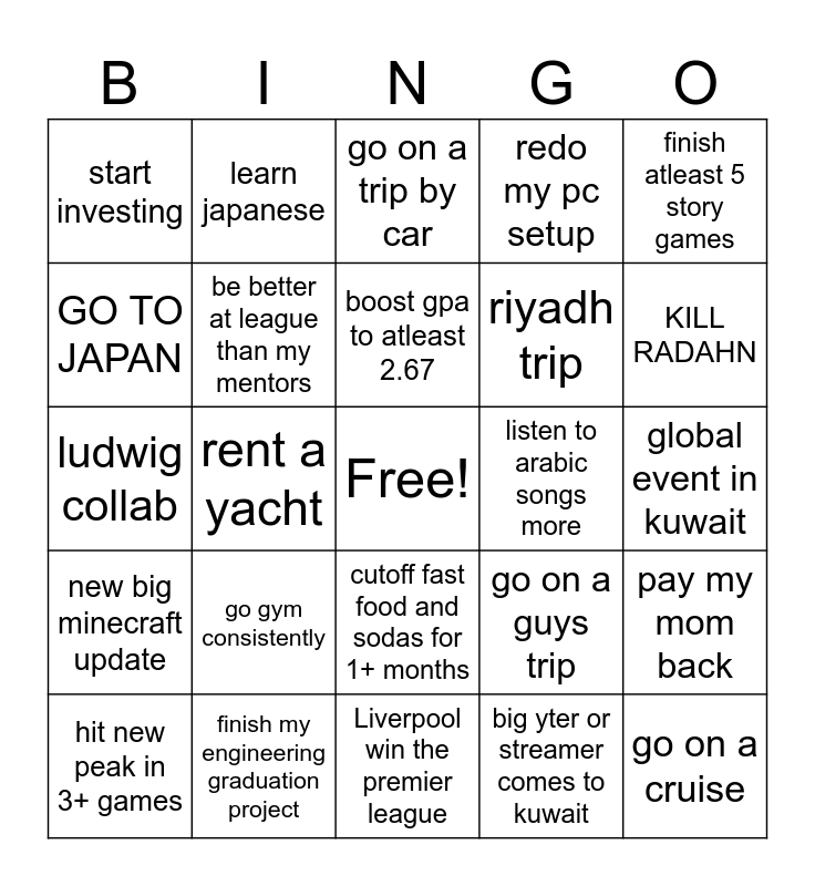 This bingo card has a free space and 24 words: go gym consistently, finish my engineering graduation project, boost gpa to atleast 2.67, hit new peak in 3+ games, finish atleast 5 story games, start investing, GO TO JAPAN, learn japanese, listen to arabic songs more, cutoff fast food and sodas for 1+ months, riyadh trip, ludwig collab, go on a guys trip, pay my mom back, be better at league than my mentors, big yter or streamer comes to kuwait, global event in kuwait, go on a trip by car, KILL RADAHN, rent a yacht, go on a cruise, new big minecraft update, redo my pc setup and Liverpool win the premier league.