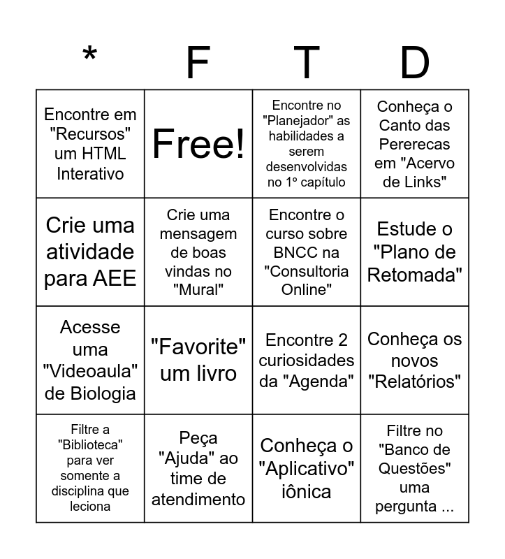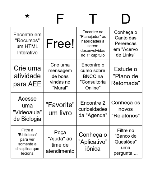 This bingo card has 19 words: Encontre 2 curiosidades da "Agenda", Proponha uma estrutura de Sequência didática para um "Curso", Encontre no "Planejador" as habilidades a serem desenvolvidas no 1º capítulo, Filtre no "Banco de Questões" uma pergunta ..., Conheça os novos "Relatórios", Crie uma atividade para AEE, Conheça o "Aplicativo" iônica, Encontre em "Recursos" um HTML Interativo, Free!, Acesse uma "Videoaula" de Biologia, "Favorite" um livro, Crie uma mensagem de boas vindas no "Mural", Encontre o curso sobre BNCC na "Consultoria Online", Peça "Ajuda" ao time de atendimento, Filtre a "Biblioteca" para ver somente a disciplina que leciona, Acesse o "Guia para Inclusão", Conheça o Canto das Pererecas em "Acervo de Links", Estude o "Plano de Retomada" and Veja os "Complementos de Literatura" e escolha um que se relacione com sua disciplina.
