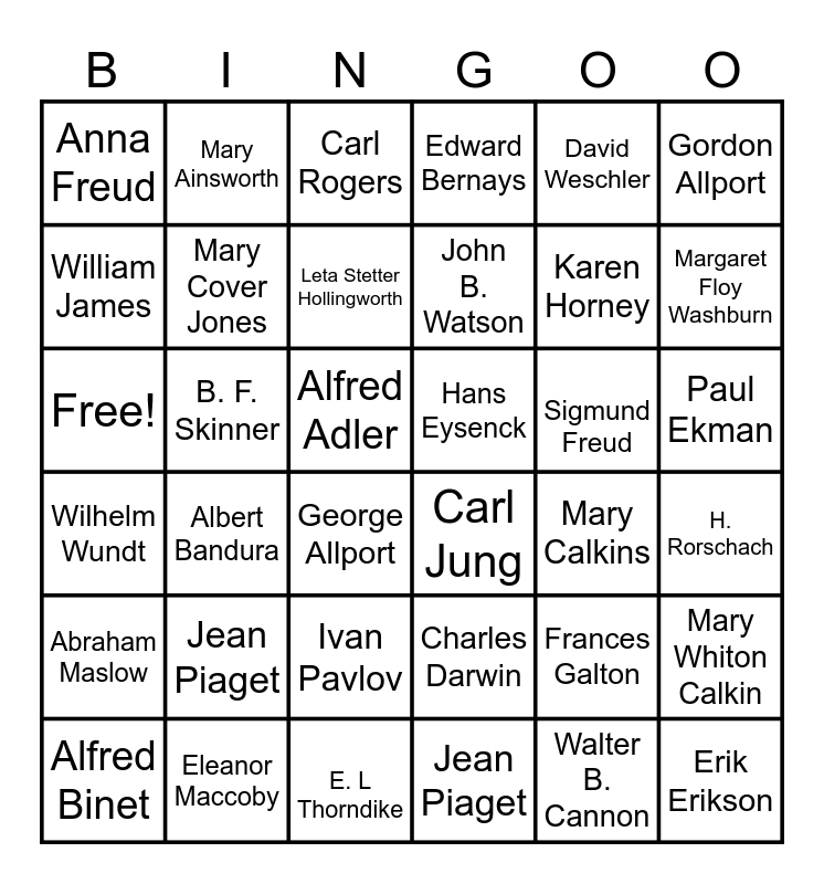 This bingo card has 36 words: Charles Darwin, Ivan Pavlov, Jean Piaget, William James, Wilhelm Wundt, Hans Eysenck, Mary Cover Jones, E. L Thorndike, David Weschler, Frances Galton, Margaret Floy Washburn, Edward Bernays, Mary Whiton Calkin, B. F. Skinner, John B. Watson, Anna Freud, Abraham Maslow, Sigmund Freud, Free!, Carl Rogers, Alfred Adler, Albert Bandura, Carl Jung, George Allport, Mary Calkins, Mary Ainsworth, Karen Horney, Eleanor Maccoby, Leta Stetter Hollingworth, Gordon Allport, Erik Erikson, Alfred Binet, H. Rorschach, Paul Ekman, Jean Piaget and Walter B. Cannon.