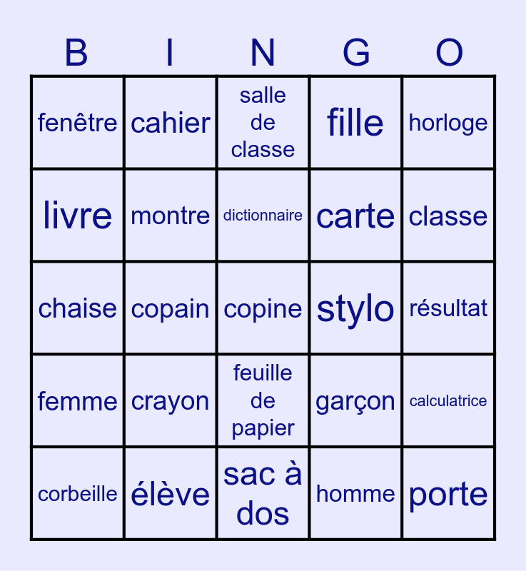 This bingo card has 25 words: crayon, sac à dos, dictionnaire, corbeille, horloge, fenêtre, livre, cahier, stylo, feuille de papier, carte, chaise, garçon, calculatrice, montre, porte, résultat, salle de classe, classe, copain, copine, élève, femme, fille and homme.