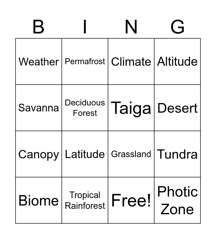 This bingo card has 17 words: Free!, Biome, Climate, Weather, Latitude, Altitude, Tundra, Taiga, Desert, Deciduous Forest, Tropical Rainforest, Grassland, Savanna, Permafrost, Canopy, Understory and Photic Zone.