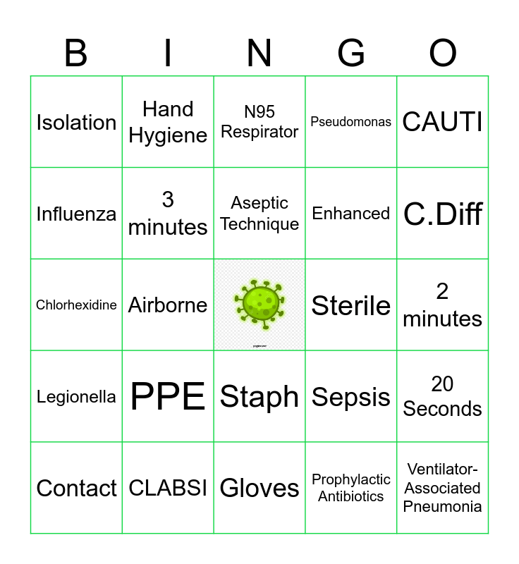This bingo card has a free space and 24 words: PPE, CLABSI, Aseptic Technique, Contact, CAUTI, Isolation, Influenza, Hand Hygiene, Sterile, Staph, Enhanced, Chlorhexidine, Sepsis, 20 Seconds, 3 minutes, Prophylactic Antibiotics, 2 minutes, N95 Respirator, C.Diff, Airborne, Ventilator-Associated Pneumonia, Legionella, Pseudomonas and Gloves.