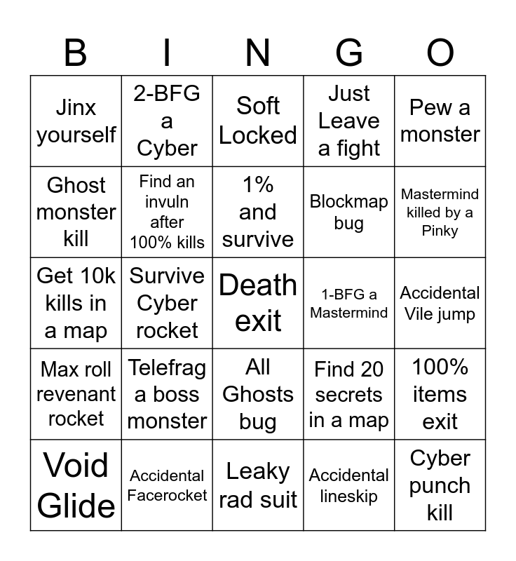 This bingo card has 25 words: Telefrag a boss monster, Leaky rad suit, 1% and survive, Void Glide, Pew a monster, Jinx yourself, Ghost monster kill, 2-BFG a Cyber, 1-BFG a Mastermind, All Ghosts bug, Blockmap bug, Get 10k kills in a map, Find 20 secrets in a map, 100% items exit, Find an invuln after 100% kills, Cyber punch kill, Accidental Vile jump, Soft Locked, Mastermind killed by a Pinky, Survive Cyber rocket, Death exit, Accidental Facerocket, Max roll revenant rocket, Just Leave a fight and Accidental lineskip.