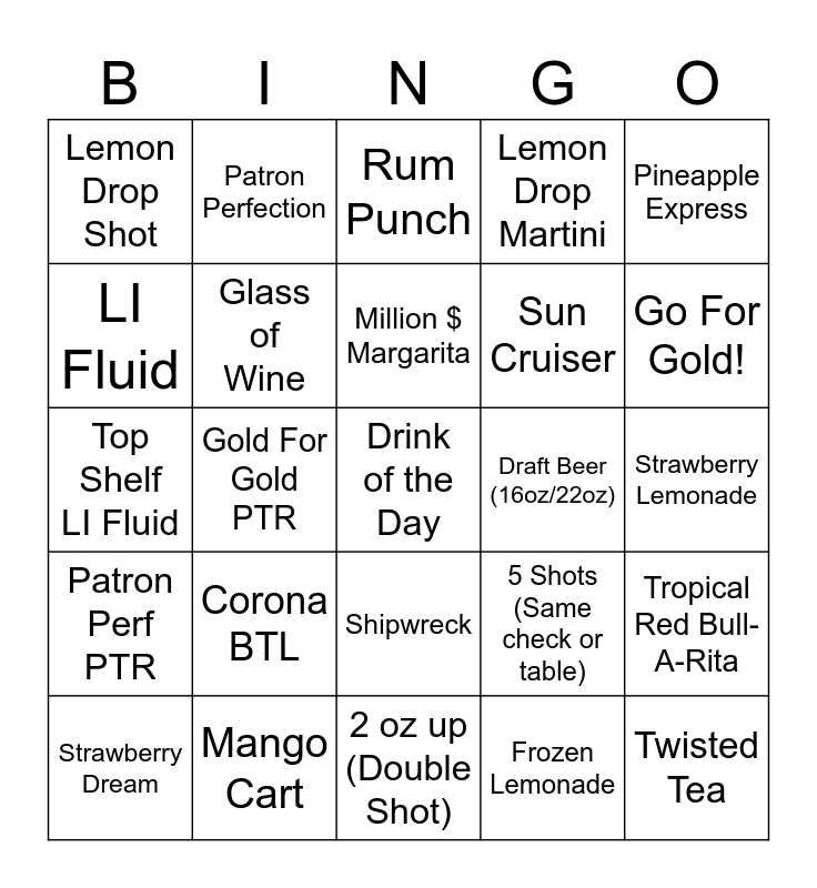 This bingo card has a free space and 24 words: Strawberry Dream, Corona BTL, Million $ Margarita, Frozen Lemonade, Pineapple Express, Lemon Drop Shot, Patron Perfection, Rum Punch, Draft Beer (16oz/22oz), Strawberry Lemonade, Top Shelf LI Fluid, Glass of Wine, 5 Shots (Same check or table), Tropical Red Bull-A-Rita, LI Fluid, Mango Cart, 2 oz up (Double Shot), Lemon Drop Martini, Go For Gold!, Patron Perf PTR, Gold For Gold PTR, Shipwreck, Sun Cruiser and Twisted Tea.