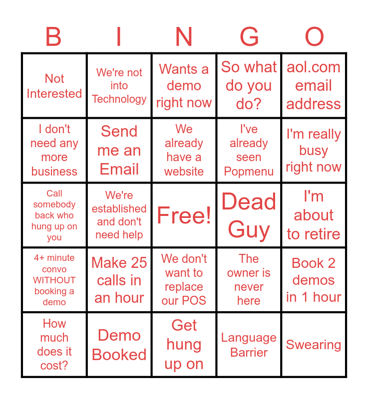 This bingo card has a free space and 24 words: Make 25 calls in an hour, Demo Booked, We already have a website, How much does it cost?, aol.com email address, Not Interested, I don't need any more business, We're not into Technology, Dead Guy, We don't want to replace our POS, I've already seen Popmenu, Call somebody back who hung up on you, The owner is never here, Book 2 demos in 1 hour, Send me an Email, Language Barrier, I'm about to retire, Wants a demo right now, I'm really busy right now, We're established and don't need help, Swearing, 4+ minute convo WITHOUT booking a demo, So what do you do? and Get hung up on.