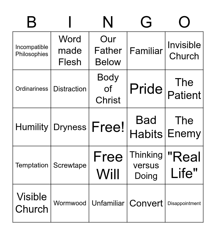 This bingo card has a free space and 24 words: Screwtape, Wormwood, Body of Christ, Visible Church, Invisible Church, Incompatible Philosophies, Ordinariness, Word made Flesh, Bad Habits, Free Will, Pride, Humility, Thinking versus Doing, "Real Life", Distraction, Convert, The Enemy, Our Father Below, The Patient, Dryness, Disappointment, Temptation, Familiar and Unfamiliar.
