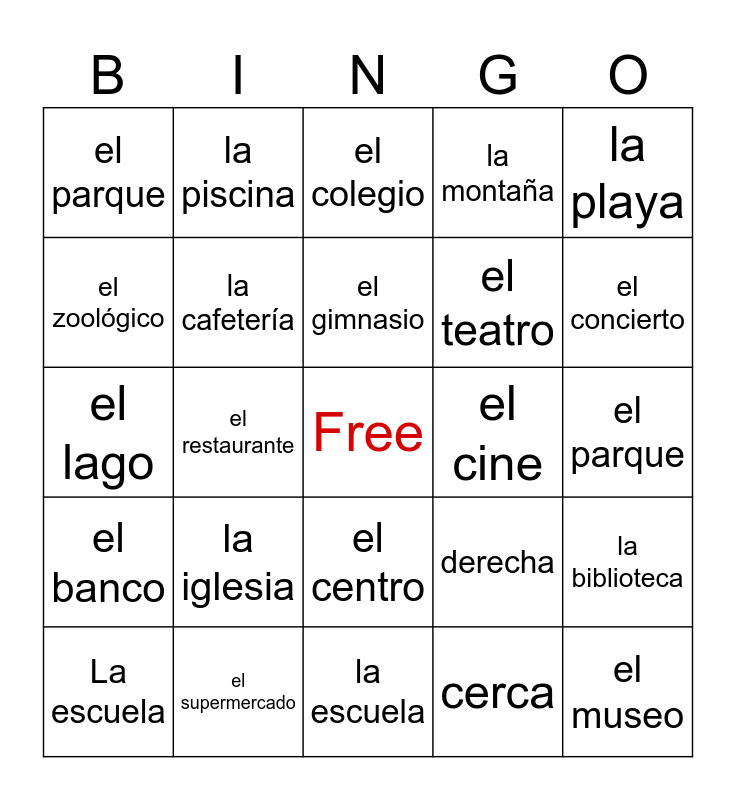 This bingo card has a free space and 32 words: cerca, izquierda, el restaurante, la universidad, el banco, la cafetería, la playa, la biblioteca, la piscina, la fiesta, el gimnasio, el colegio, la tienda, la casa, el cine, el correo, La escuela, el lago, el centro, la iglesia, derecha, los lugares, el parque, el supermercado, el museo, la montaña, el teatro, el zoológico, el parque, la escuela, el club and el concierto.