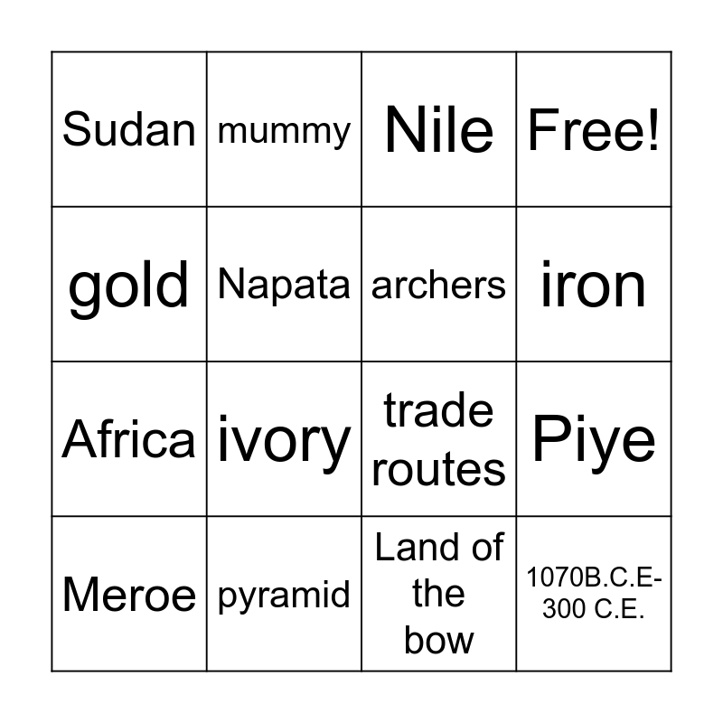 This bingo card has 16 words: Meroe, pyramid, Nile, Free!, gold, mummy, trade routes, Piye, Sudan, Napata, Land of the bow, iron, Africa, ivory, archers and 1070B.C.E-300 C.E..