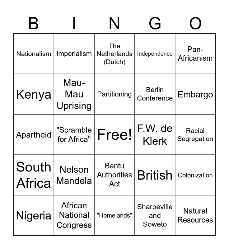 This bingo card has a free space and 24 words: Nelson Mandela, African National Congress, Partitioning, Nigeria, Pan-Africanism, Nationalism, Kenya, Imperialism, F.W. de Klerk, Bantu Authorities Act, Berlin Conference, Apartheid, British, Colonization, Mau-Mau Uprising, Sharpeville and Soweto, Racial Segregation, The Netherlands (Dutch), Embargo, "Scramble for Africa", Natural Resources, South Africa, Independence and "Homelands".