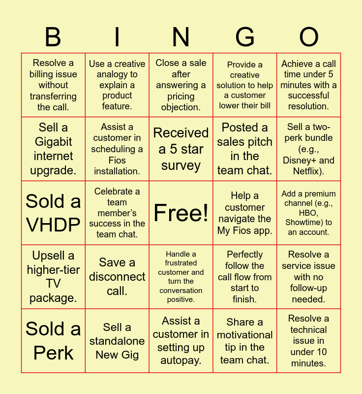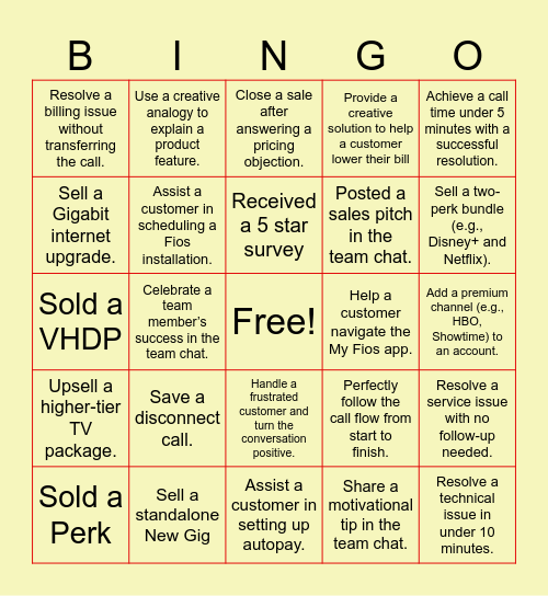This bingo card has a free space and 24 words: Save a disconnect call., Sell a standalone New Gig, Received a 5 star survey, Sold a Perk, Achieve a call time under 5 minutes with a successful resolution., Resolve a billing issue without transferring the call., Sell a Gigabit internet upgrade., Use a creative analogy to explain a product feature., Help a customer navigate the My Fios app., Handle a frustrated customer and turn the conversation positive., Posted a sales pitch in the team chat., Sold a VHDP, Perfectly follow the call flow from start to finish., Resolve a service issue with no follow-up needed., Assist a customer in scheduling a Fios installation., Share a motivational tip in the team chat., Add a premium channel (e.g., HBO, Showtime) to an account., Close a sale after answering a pricing objection., Sell a two-perk bundle (e.g., Disney+ and Netflix)., Celebrate a team member’s success in the team chat., Resolve a technical issue in under 10 minutes., Upsell a higher-tier TV package., Provide a creative solution to help a customer lower their bill and Assist a customer in setting up autopay..