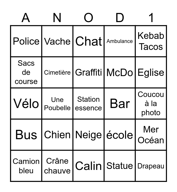 This bingo card has a free space and 24 words: Chien, Crâne chauve, Graffiti, Camion bleu, Kebab Tacos, Police, Sacs de course, Vache, Bar, Neige, McDo, Vélo, école, Mer Océan, Cimetière, Statue, Coucou à la photo, Chat, Eglise, Une Poubelle, Drapeau, Bus, Ambulance and Calin.