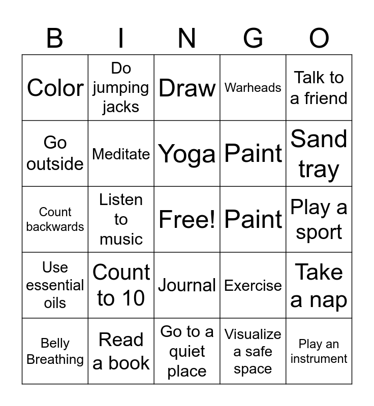 This bingo card has a free space and 24 words: Count to 10, Read a book, Yoga, Belly Breathing, Talk to a friend, Color, Go outside, Do jumping jacks, Paint, Journal, Paint, Count backwards, Exercise, Take a nap, Meditate, Visualize a safe space, Play a sport, Draw, Sand tray, Listen to music, Play an instrument, Use essential oils, Warheads and Go to a quiet place.