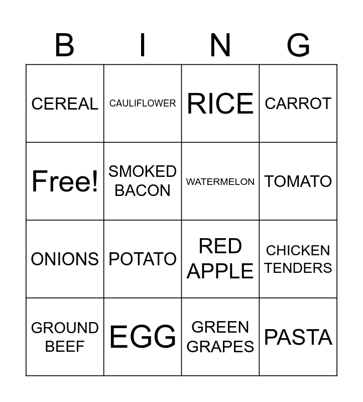 This bingo card has 16 words: EGG, CHICKEN TENDERS, RICE, CEREAL, ONIONS, CAULIFLOWER, RED APPLE, GREEN GRAPES, Free!, SMOKED BACON, GROUND BEEF, CARROT, POTATO, TOMATO, WATERMELON and PASTA.