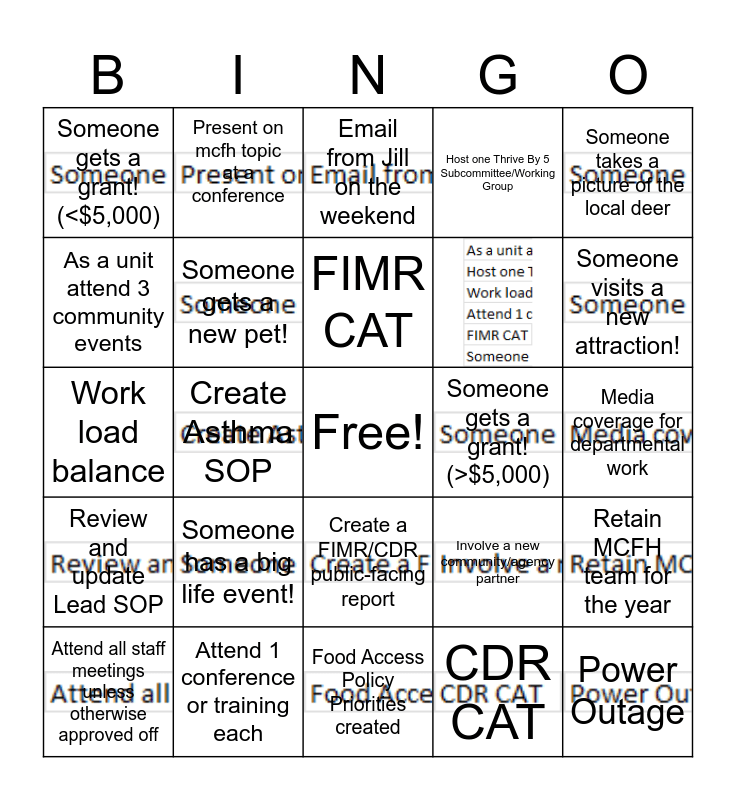This bingo card has 25 images, a free space and 30 words: Food Access Policy Priorities created, The AC breaks :(, Create Asthma SOP, Cross-departmental project completed, Someone gets a grant! (<$5,000), Email from Jill on the weekend, Someone gets a new pet!, Involve a new community/agency partner, Someone gets a grant! (>$5,000), CDR CAT, Media coverage for departmental work, Power Outage, Recruit healthcare partners to refer to asthma program, Tornado warning at work!, Someone visits a new attraction!, Someone learns a new piece of software, Retain MCFH team for the year, Someone has a big life event!, Review and update Lead SOP, Create a FIMR/CDR public-facing report, Someone takes a picture of the local deer, School Wellness Assessment completed, Attend all staff meetings unless otherwise approved off, Present on mcfh topic at a conference, As a unit attend 3 community events, Host one Thrive By 5 Subcommittee/Working Group, Work load balance, Attend 1 conference or training each, FIMR CAT and Someone finds mouse droppings :(.
