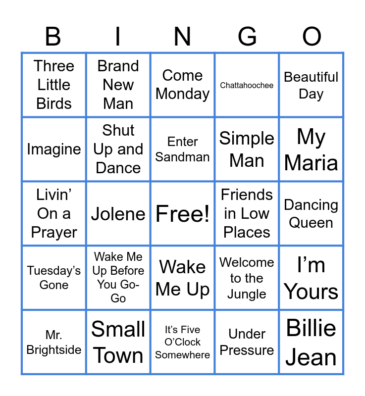 This bingo card has a free space and 100 words: Africa, Knee Deep, It’s Five O’Clock Somewhere, Sweet Home Alabama, I Love Rock ‘N Roll, Free Bird, Thunderstruck, Crazy Train, Beautiful Crazy, Take On Me, Sweet Caroline, Hotel California, 9 to 5, Friends in Low Places, Tennessee Whiskey, White Horse, Jolene, Take Me Home, Country Roads, I Wanna Dance With Somebody, Sweet Child O’ Mine, Someone Like You, Man! I Feel Like a Woman!, One Love/ People Get Ready, Could You Be Loved, Red Red Wine, Mr. Brightside, Shut Up and Dance, Wake Me Up, Head Over Boots, Cleopatra, Tuesday’s Gone, Brand New Man, Any Man of Mine, Bohemian Rhapsody, Eye of the Tiger, Livin’ On a Prayer, Don’t Stop Me Now, Don’t Stop Believin’, Under Pressure, Back In Black, Another Bites the Dust, Go Your Own Way, Enter Sandman, Welcome to the Jungle, Dancing Queen, Imagine, Summer of ‘69, Brown Eyed Girl, Uptown Girl, Billie Jean, I Walk the Line, Barefoot Blue Jean Night, One Margarita, Sand In My Boots, Dance The Night, Blinding Lights, What Is Love, On Top of the World, CAN’T STOP THE FEELING, Beautiful Day, Uptown Funk, Stronger, She Got the Best of Me, When It Rains It Pours, Take a Chance On Me, Free Fallin’, Jack & Diane, We Didn’t Start the Fire, Jessie’s Girl, Glory Days, Paradise City, Small Town, Bad to the Bone, Girls Just Want to Have Fun, Break My Stride, How Will I Know, Margaritaville, Come Monday, Cheeseburger In Paradise, Cowboy Take Me Away, Hey Ya!, Wake Me Up Before You Go-Go, On The Road Again, Chattahoochee, Boot Scootin’ Boogie, Three Little Birds, Stayin’ Alive, Stand By Me, Rolling In the Deep, I’m Yours, Dirt on My Boots, Castaway, Chicken Fried, Simple Man, My Maria, Somebody to Love, Millionaire, Rich Girl, Life Is a Highway and Should’ve Been A Cowboy.