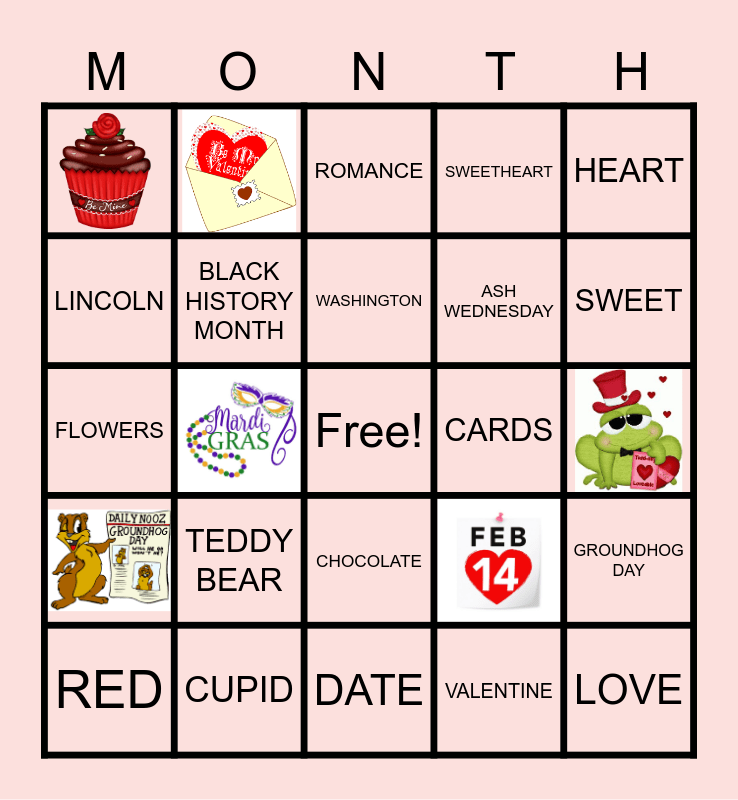 This bingo card has 16 images, a free space and 29 words: DOVE, LOVE, PINK, RED, ROSES, VALENTINE, ROMANCE, KISS, HEART, CUPID, SWEETHEART, CARDS, CHOCOLATE, TEDDY BEAR, POEM, DATE, CARD, FLOWERS, CANDLE, SWEET, FEBRUARY, GROUNDHOG DAY, PRESIDENTS DAY, National Pistachio Day, WASHINGTON, LINCOLN, ASH WEDNESDAY, BLACK HISTORY MONTH and WINTER.