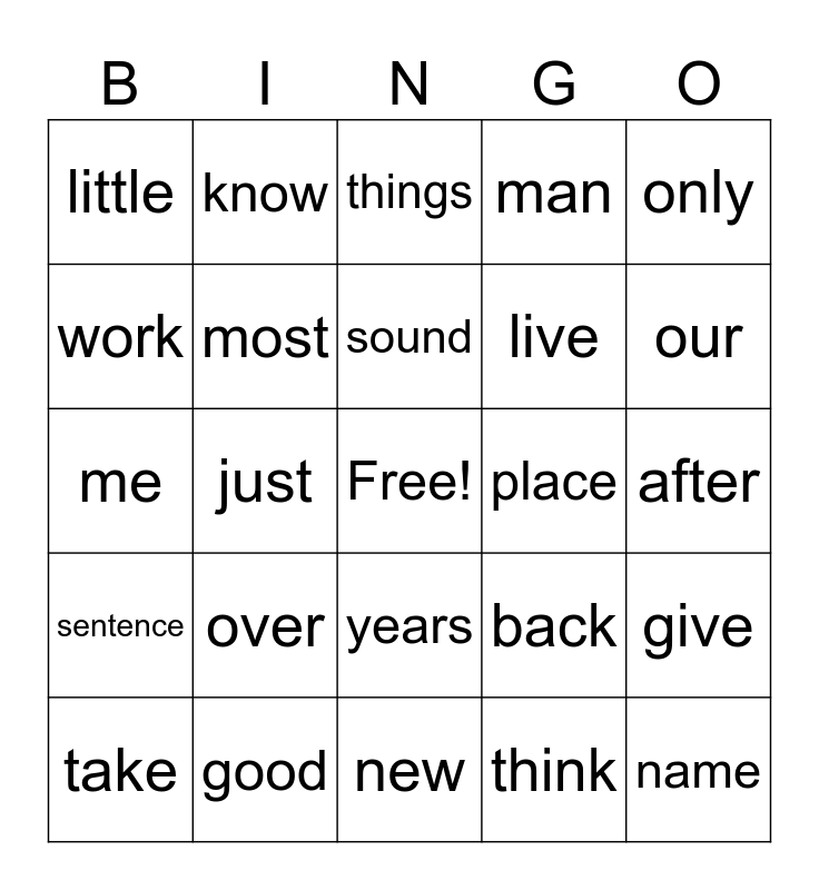 This bingo card has a free space and 25 words: over, new, sound, take, only, little, work, know, place, years, live, me, back, give, most, very, after, things, our, just, name, good, sentence, man and think.
