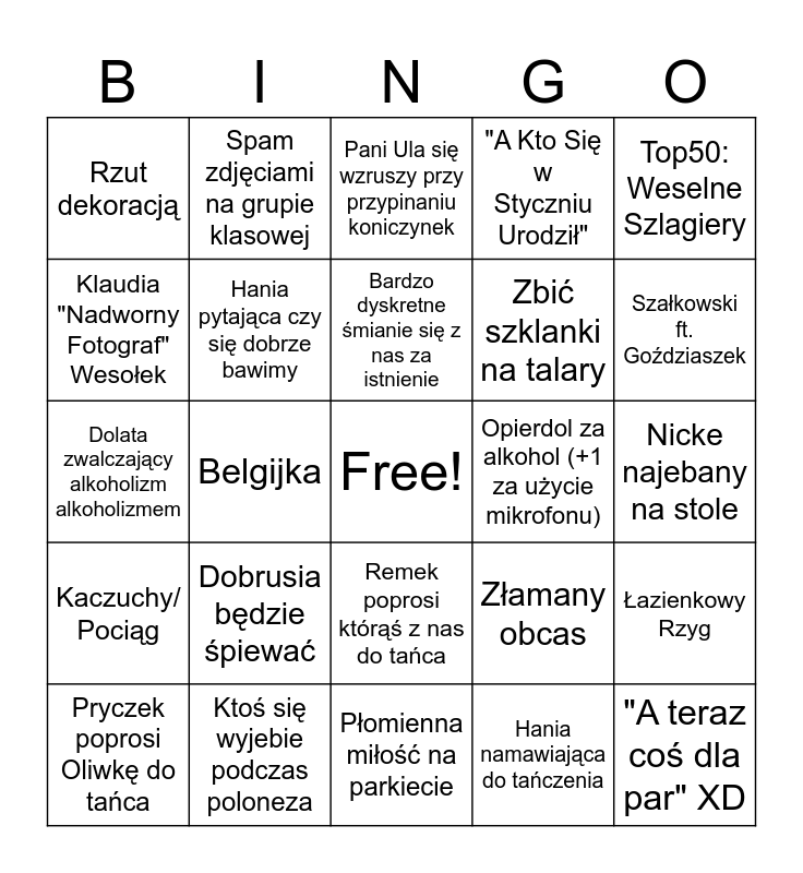 This bingo card has a free space and 24 words: Dobrusia będzie śpiewać, Ktoś się wyjebie podczas poloneza, Bardzo dyskretne śmianie się z nas za istnienie, Pryczek poprosi Oliwkę do tańca, Top50: Weselne Szlagiery, Rzut dekoracją, Klaudia "Nadworny Fotograf" Wesołek, Spam zdjęciami na grupie klasowej, Opierdol za alkohol (+1 za użycie mikrofonu), Remek poprosi którąś z nas do tańca, Zbić szklanki na talary, Dolata zwalczający alkoholizm alkoholizmem, Złamany obcas, Łazienkowy Rzyg, Hania pytająca czy się dobrze bawimy, Hania namawiająca do tańczenia, Nicke najebany na stole, Pani Ula się wzruszy przy przypinaniu koniczynek, Szałkowski ft. Goździaszek, Belgijka, "A teraz coś dla par" XD, Kaczuchy/ Pociąg, "A Kto Się w Styczniu Urodził" and Płomienna miłość na parkiecie.