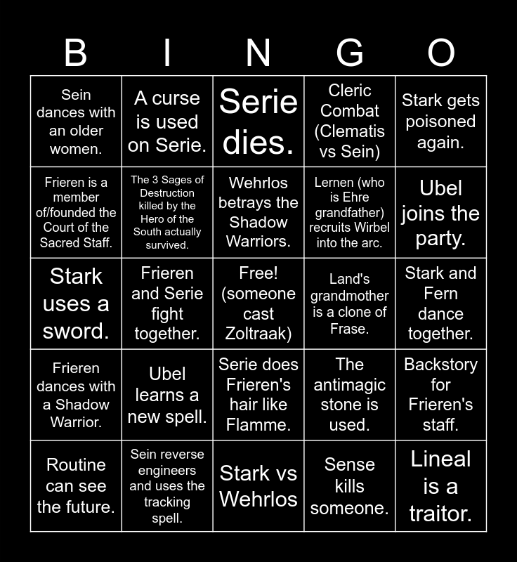 This bingo card has a free space and 24 words: Ubel learns a new spell., Sein reverse engineers and uses the tracking spell., Wehrlos betrays the Shadow Warriors., Routine can see the future., Stark gets poisoned again., Sein dances with an older women., Frieren is a member of/founded the Court of the Sacred Staff., A curse is used on Serie., Land's grandmother is a clone of Frase., Serie does Frieren's hair like Flamme., Lernen (who is Ehre grandfather) recruits Wirbel into the arc., Stark uses a sword., The antimagic stone is used., Backstory for Frieren's staff., The 3 Sages of Destruction killed by the Hero of the South actually survived., Sense kills someone., Stark and Fern dance together., Serie dies., Ubel joins the party., Frieren and Serie fight together., Lineal is a traitor., Frieren dances with a Shadow Warrior., Cleric Combat (Clematis vs Sein) and Stark vs Wehrlos.