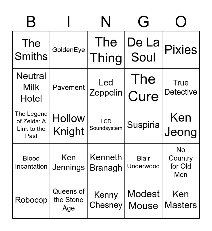 This bingo card has 60 words: Cattle Decapitation, Queens of the Stone Age, The Smashing Pumpkins, Blood Incantation, Modest Mouse, Deftones, Pavement, Joy Division, The Cure, Brand New, De La Soul, Outkast, Neutral Milk Hotel, The Black Dahlia Murder, Radiohead, The Smiths, LCD Soundsystem, Pixies, The Beatles, Led Zeppelin, Suspiria, The Thing, Robocop, No Country for Old Men, Adaptation, The Banshees of Inisherin, RRR, Mandy, True Detective, Fargo, Curb your Enthusiasm, Seinfeld, Late Night with Conan O’Brien, The Legend of Zelda: Ocarina of Time, GoldenEye, World of Warcraft, Dota 2, Hollow Knight, Super Metroid, The Legend of Zelda: A Link to the Past, Barbie’s friend - Ken, Ken Jennings, Ken Jeong, Selma Blair, Blair Underwood, Ken Griffey Jr., Kenny Rogers, Kenny Loggins, Kenny G, Kenneth Branagh, Kenny Chesney, Ken Shamrock, Kenneth Cole, Blair Butler, Blair Witch, Blair Waldorf, Blair, Kenny McCormick, Ken Masters and Kenny Powers.