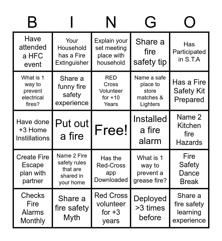 This bingo card has a free space and 24 words: Checks Fire Alarms Monthly, Name 2 Fire safety rules that are shared in your home, RED Cross Volunteer for +10 Years, Deployed >3 times before, Has Participated in S.T.A, Have attended a HFC event, Your Household has a Fire Extinguisher, Explain your set meeting place with household, Installed a fire alarm, Name 2 Kitchen fire Hazards, Have done +3 Home Instillations, Share a funny fire safety experience, What is 1 way to prevent a grease fire?, Fire Safety Dance Break, What is 1 way to prevent electrical fires?, Share a fire safety Myth, Red Cross volunteer for +3 years, Share a fire safety tip, Has a Fire Safety Kit Prepared, Create Fire Escape plan with partner, Put out a fire, Has the Red-Cross app Downloaded, Name a safe place to store matches & Lighters and Share a fire safety learning experience.
