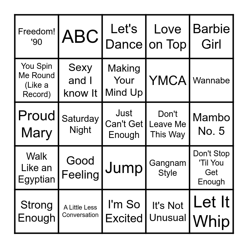 This bingo card has 75 words: Waterloo, Knock on Wood, Let's Dance, U Can't Touch This, Turn the Beat Around, Freeway Of Love, You Should Be Dancing, Let's Get It Started, Play That Funky Music, Jump Around, Let It Whip, 24K Magic, Making Your Mind Up, You Spin Me Round (Like a Record), Rhythm Of the Night, Saturday Night, Thrift Shop, Just Can't Get Enough, September, Barbie Girl, I'm Your Man, Proud Mary, Sexy and I know It, ABC, Love on Top, Macarena, Celebration, Good Vibrations, Moving on Up, This Is How We Do It, Get the Party Started, Sussudio, Raspberry Beret, Gangnam Style, Wannabe, YMCA, If You Could Read My Mind, Dance Monkey, Mambo No. 5, It's Not Unusual, Boom, Boom, Boom, Boom!, Can You Feel It, December, 1963 (Oh What a Night!), Gettin' Jiggy Wit It, Get Down Tonight, SOS, Strong Enough, Freedom! '90, Xanadu, O.P.P, Uptown Funk, Jump, You're The One That I Want, 1999, Whoomp! (There It Is), The Way I Are, Firework, Love Shack, Pump It, Blame It on the Boogie, Good Feeling, Footloose, Let's Get Loud, Disco Inferno, So What, Don't Leave Me This Way, Timber, Give It Up, Spice Up Your Life, Don't Stop 'Til You Get Enough, Walk Like an Egyptian, A Little Less Conversation, How Will I Know, I'm So Excited and The Way You Make Me Feel.