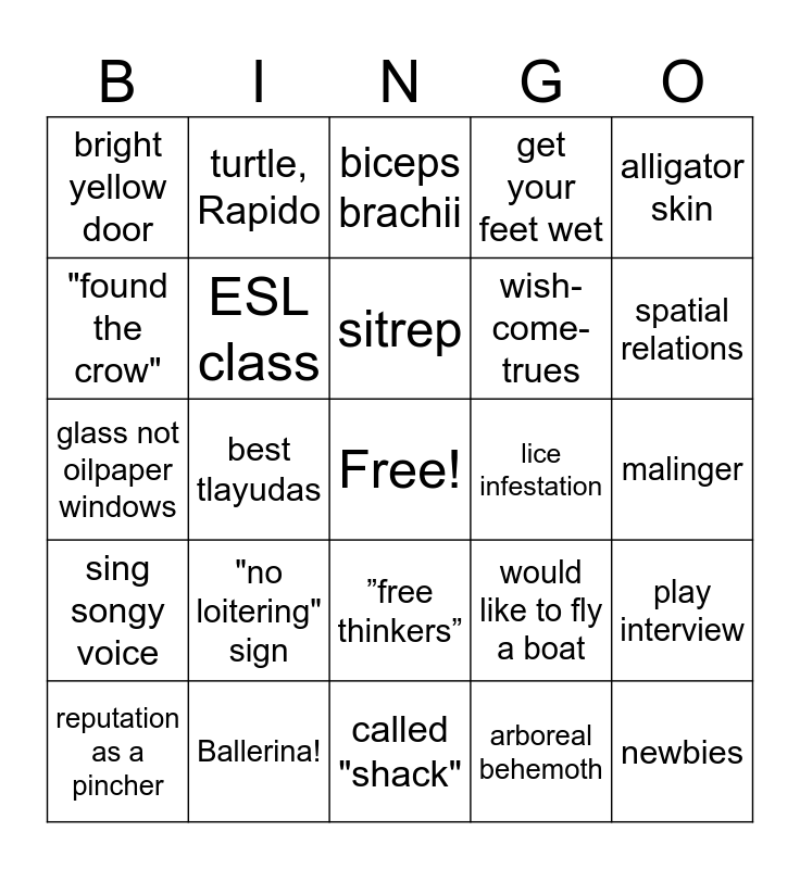 This bingo card has a free space and 50 words: hospital talk, newbies, The About to Pass Out Show, called "shack", "no loitering" sign, sleep paralysis, turtle, Rapido, sweet hyacinth breath, "found the crow", "Goldilocks planet", ESL class, get your feet wet, play interview, would like to fly a boat, never have the gaar, lava tube, sitrep, lice infestation, concussion, alligator skin, best tlayudas, arboreal behemoth, bright yellow door, wish-come-trues, all acts have consequences, atomic model construction set- deluxe edition, spatial relations, the dog squad, biceps brachii, ”free thinkers”, totally on the house, arrest warrants in four states, anaquote, go to sub basement, Ballerina!, Father with a capital F, missed their left arm, book in Braille, back before the tulips bloom, malinger, secretly “cased the joint”, Trickster King, expert on "big boys", size 26 feet, reputation as a pincher, glass not oilpaper windows, know Germany as Prussia, "kind of a nothing disease", sing songy voice and had to tip toe because of boots.