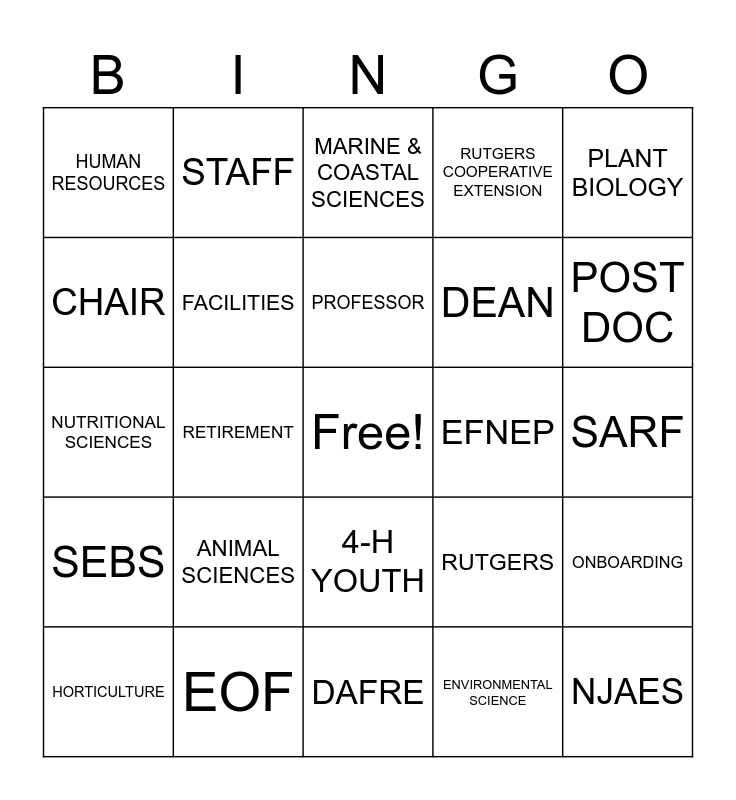 This bingo card has a free space and 43 words: EENR, NJAES, FARM, HORTICULTURE, HUMAN ECOLOGY, ENVIRONMENTAL SCIENCE, MARINE & COASTAL SCIENCES, BIOCHEM & MICROBIOLOGY, PLANT BIOLOGY, EOF, RUTGERS COOPERATIVE EXTENSION, EFNEP, 4-H YOUTH, ANIMAL SCIENCES, ENTOMOLOGY, DAFRE, LANDSCAPE ARCHITECHTURE, NUTRITIONAL SCIENCES, FACULTY, POST DOC, STAFF, STUDENT WORKERS, JOB CLASS CODES, HUMAN RESOURCES, ORG CHART, SARF, CARF, PERFORMANCE EVALUATION, RUTGERS, SEBS, OFFBOARDING, ONBOARDING, TERMINATIONS, RETIREMENT, PAYROLL, UHR, ONESOURCE, PROFESSOR, CHAIR, DEAN, LABORATORY, FACILITIES and IFNH.