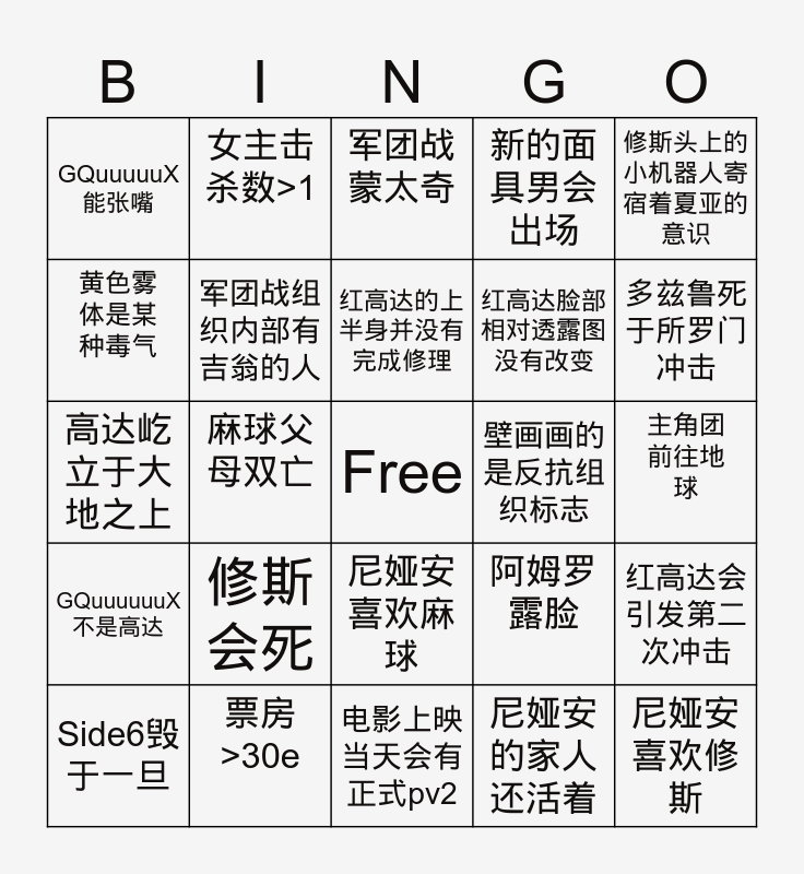 This bingo card has a free space and 24 words: Side6毁于一旦, 修斯会死, 红高达的上半身并没有完成修理, 尼娅安的家人还活着, 修斯头上的小机器人寄宿着夏亚的意识, GQuuuuuX能张嘴, 女主击杀数>1, 军团战蒙太奇, 壁画画的是反抗组织标志, 主角团前往地球, 高达屹立于大地之上, 军团战组织内部有吉翁的人, 阿姆罗露脸, 红高达会引发第二次冲击, 黄色雾体是某种毒气, 票房>30e, 电影上映当天会有正式pv2, 新的面具男会出场, 多兹鲁死于所罗门冲击, GQuuuuuuX不是高达, 麻球父母双亡, 尼娅安喜欢麻球, 红高达脸部相对透露图没有改变 and 尼娅安喜欢修斯.