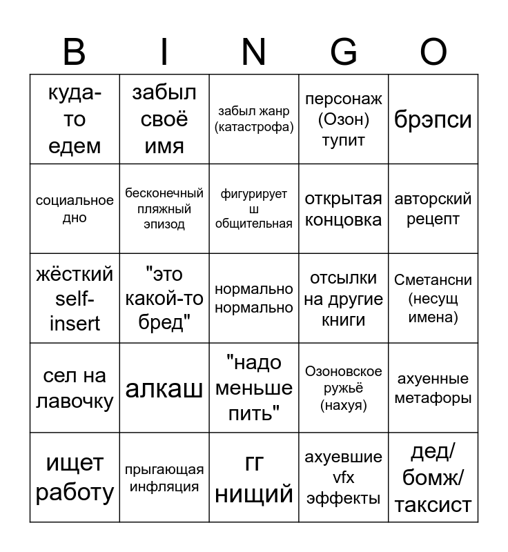 This bingo card has a free space and 24 words: ищет работу, алкаш, фигурирует ш общительная, ахуевшие vfx эффекты, брэпси, куда-то едем, забыл своё имя, забыл жанр (катастрофа), отсылки на другие книги, Сметансни (несущ имена), жёсткий self-insert, бесконечный пляжный эпизод, Озоновское ружьё (нахуя), ахуенные метафоры, социальное дно, прыгающая инфляция, гг нищий, персонаж (Озон) тупит, авторский рецепт, сел на лавочку, "это какой-то бред", "надо меньше пить", открытая концовка and дед/бомж/таксист.
