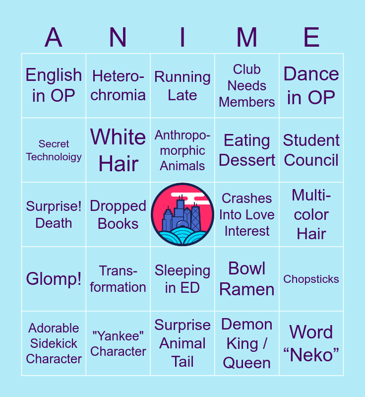 This bingo card has a free space and 119 words: Protag is OP, Love at First Sight, Dead Mother, Transfer Student, School Shut Down, Club Shut Down, Club Needs Members, Main Character Hair, Protag Classroom Seat, Akira Bike Skid, Where Are The Parents?, English Loan Word, Running in OP, Bird in OP, Running in ED, Bird in ED, Sleeping in ED, Orphan, School Club, Nose Bleed, Adorable Sidekick Character, Running Late, Super Powers, Giant Robot, Clearly a Harem Show, Glomp!, "Yankee" Character, Childhood Friend, Isekai, Amnesia, Student Council, Anthropo-morphic Animals, Dropped Books, Looong Title, Two Riders, One Bike, Public Bath, Secret Inheritance, “Oniichan” / “Oniisan”, “Oneechan” / “Oneesan”, Magical Girl, Kappa, Running With Toast, MF Jojo Reference, Pompadour Hair, Generic Male Protag, Generic Female Protag, Crashes Into Love Interest, Demon King / Queen, Sleeping in School, Surprise Animal Tail, Weird Hobby, Bowl Ramen, Cup Ramen, Thigh Highs, Abandoned as a Baby, Word "Ojīsan", Mysterious Message, Inanimate Object is Alive!, Special Hair Clip, Talisman / Amulet, Magic Wand, Magic Necklace, Lavender / Purple Hair, Green Hair, Blue Hair, White Hair, Sakura Tree / Blossoms, Curry Meal, Eating Dessert, Surprise! Death, Fake Brand Name, Multi-color Hair, Cat in OP, Cat in ED, Only One Eye, Box of Curry, Truck-kun Strikes, Word “Neko”, Trans-formation, English in OP, Yokai, Special Jewelry, “Nani??”, Spirit Leaves Body, Internal Monologue, Twins, Magic / Special Creature, Elite School, Hetero- chromia, Reincarnation, Disaster Opening Scene, Bento, Onigiri, Facial Scar, Eyeglass Glint, Cat / Kitten in a Box, Dance in OP, Someone is a Demon, Someone is a Vampire, Zombies, Giant Twin Tails, Word “Foreigner”, Secret Mission / Goal, Flashback, Looong Staircase, Local River, Based on a Game, Secret Alien, Cicada, Zap!, Magic Circle, Secret Technoloigy, Three-Wheel Truck, Sleep / Nose Bubble, Eye Flash!, Hand Raised to Light, Piles of Trash, Chopsticks and Word "Obāsan".