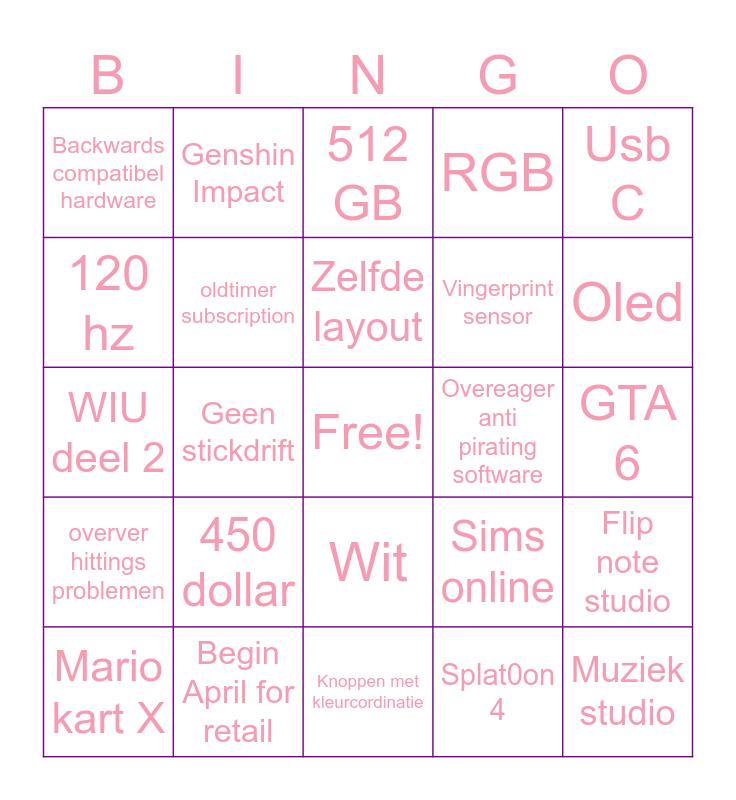 This bingo card has a free space and 24 words: 450 dollar, Begin April for retail, Zelfde layout, Mario kart X, Usb C, Backwards compatibel hardware, 120 hz, Genshin Impact, Overeager anti pirating software, Wit, Vingerprint sensor, WIU deel 2, Sims online, Flip note studio, oldtimer subscription, Splat0on 4, GTA 6, 512 GB, Oled, Geen stickdrift, Muziek studio, overver hittings problemen, RGB and Knoppen met kleurcordinatie.