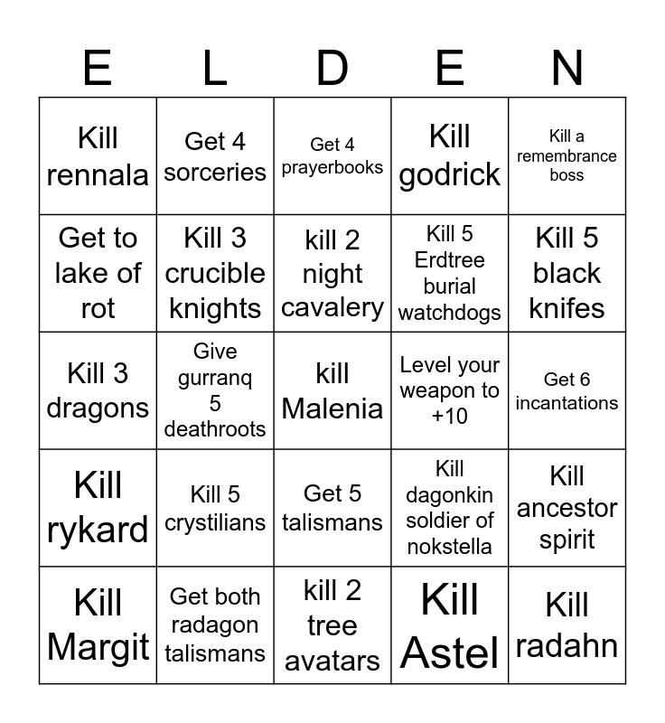 This bingo card has a free space and 24 words: Kill 5 crystilians, Get both radagon talismans, kill 2 night cavalery, Kill Margit, Kill a remembrance boss, Kill rennala, Get to lake of rot, Get 4 sorceries, Level your weapon to +10, Get 5 talismans, Kill 5 Erdtree burial watchdogs, Kill 3 dragons, Kill dagonkin soldier of nokstella, Kill ancestor spirit, Kill 3 crucible knights, Kill Astel, Get 6 incantations, Get 4 prayerbooks, Kill 5 black knifes, Give gurranq 5 deathroots, Kill radahn, Kill rykard, Kill godrick and kill 2 tree avatars.