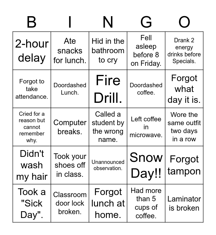 This bingo card has 25 words: Took your shoes off in class., Forgot lunch at home., Fire Drill., Took a "Sick Day"., Drank 2 energy drinks before Specials., 2-hour delay, Forgot to take attendance., Ate snacks for lunch., Left coffee in microwave., Unannounced observation., Doordashed coffee., Cried for a reason but cannot remember why., Snow Day!!, Forgot tampon, Doordashed Lunch., Laminator is broken, Wore the same outfit two days in a row, Hid in the bathroom to cry, Forgot what day it is., Computer breaks., Called a student by the wrong name., Classroom door lock broken., Didn't wash my hair, Fell asleep before 8 on Friday. and Had more than 5 cups of coffee..