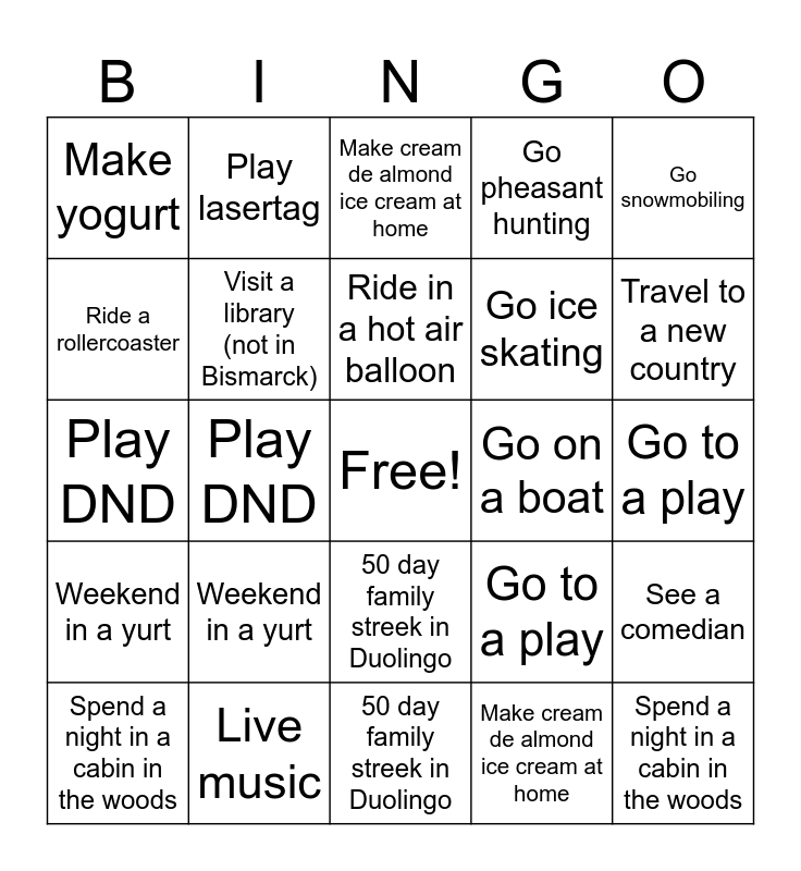 ⚠ This card has duplicate items: Travel to a new country (2), Spend a night in a cabin in the woods (2), 1/month scratch adventure (2), 50 day family streek in Duolingo (2), Weekend in a yurt (2), Play lasertag (2), Do an escape room (2), Ride a rollercoaster (2), Live music (2), Visit a library (not in Bismarck) (2), Go pheasant hunting (2), See a comedian (2), Go to a play (2), Pick chokecherries (2), Fly kites (2), Ride in a hot air balloon (2), Go on a boat (2), Go snow tubing (2), Play DND (2), Make cream de almond ice cream at home (2), Make yogurt (2), Go ice skating (2), Build our Christmas lego (2)