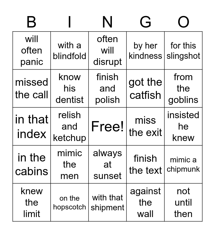 This bingo card has a free space and 34 words: know his kindness, against the wall, once a mascot, handful of nutmet, in the cabins, know his dentist, for this slingshot, knew the limit, with a blindfold, fold the napkin, finish and polish, often will disrupt, always is upset, at the clinic, miss the exit, from the goblins, on the hopscotch, in that index, mimic the men, finish the text, always at sunset, once was splashed, will often panic, insisted he knew, with that shipment, not until then, by her kindness, the British man, got the catfish, missed the call, finish the drink, relish and ketchup, mimic a chipmunk and by her kindness.