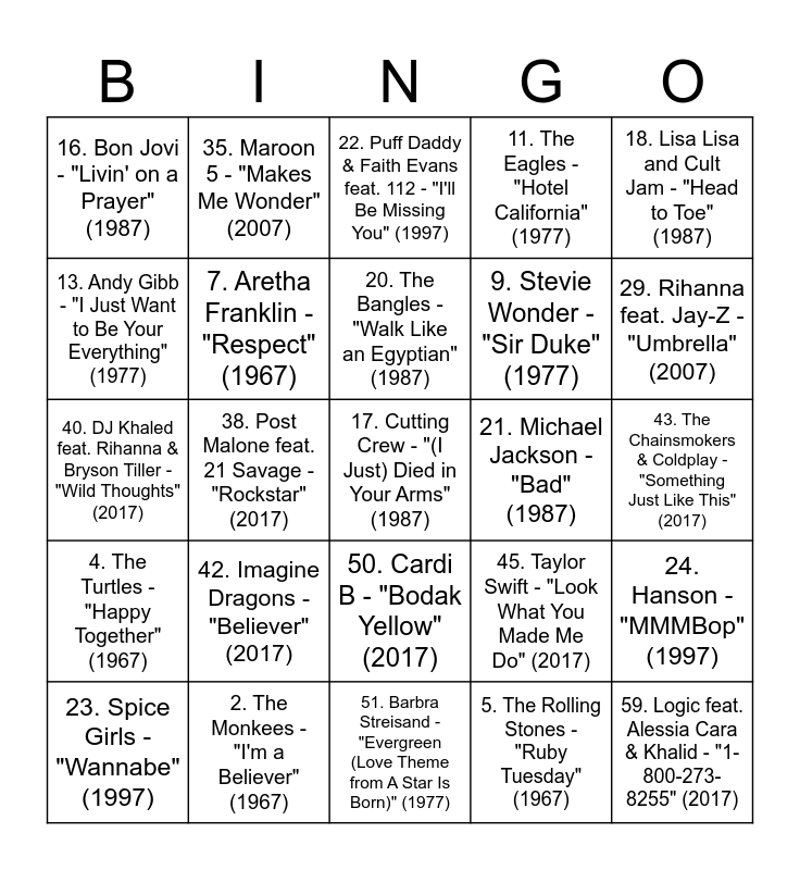 This bingo card has 60 words: 1. The Beatles - "All You Need Is Love" (1967), 2. The Monkees - "I'm a Believer" (1967), 3. The Doors - "Light My Fire" (1967), 4. The Turtles - "Happy Together" (1967), 5. The Rolling Stones - "Ruby Tuesday" (1967), 6. The Supremes - "Love Is Here and Now You're Gone" (1967), 7. Aretha Franklin - "Respect" (1967), 8. KC and the Sunshine Band - "I'm Your Boogie Man" (1977), 9. Stevie Wonder - "Sir Duke" (1977), 10. Fleetwood Mac - "Don't Stop" (1977), 11. The Eagles - "Hotel California" (1977), 12. The Emotions - "Best of My Love" (1977), 13. Andy Gibb - "I Just Want to Be Your Everything" (1977), 14. Hot - "Angel in Your Arms" (1977), 15. U2 - "With or Without You" (1987), 16. Bon Jovi - "Livin' on a Prayer" (1987), 17. Cutting Crew - "(I Just) Died in Your Arms" (1987), 18. Lisa Lisa and Cult Jam - "Head to Toe" (1987), 19. Whitesnake - "Here I Go Again" (1987), 20. The Bangles - "Walk Like an Egyptian" (1987), 21. Michael Jackson - "Bad" (1987), 22. Puff Daddy & Faith Evans feat. 112 - "I'll Be Missing You" (1997), 23. Spice Girls - "Wannabe" (1997), 24. Hanson - "MMMBop" (1997), 25. Will Smith - "Men in Black" (1997), 26. Usher - "You Make Me Wanna..." (1997), 27. Elton John - "Something About the Way You Look Tonight" (1997), 28. Beyoncé - "Irreplaceable" (2007), 29. Rihanna feat. Jay-Z - "Umbrella" (2007), 30. Avril Lavigne - "Girlfriend" (2007), 31. Plain White T's - "Hey There Delilah" (2007), 32. Sean Kingston - "Beautiful Girls" (2007), 33. Soulja Boy Tell'em - "Crank That (Soulja Boy)" (2007), 34. T-Pain feat. Yung Joc - "Buy U a Drank (Shawty Snappin')" (2007), 35. Maroon 5 - "Makes Me Wonder" (2007), 36. Ed Sheeran - "Shape of You" (2017), 37. Luis Fonsi & Daddy Yankee feat. Justin Bieber - "Despacito" (2017), 38. Post Malone feat. 21 Savage - "Rockstar" (2017), 39. Bruno Mars - "That's What I Like" (2017), 40. DJ Khaled feat. Rihanna & Bryson Tiller - "Wild Thoughts" (2017), 41. Shawn Mendes - "There's Nothing Holdin' Me Back" (2017), 42. Imagine Dragons - "Believer" (2017), 43. The Chainsmokers & Coldplay - "Something Just Like This" (2017), 44. Kendrick Lamar - "HUMBLE." (2017), 45. Taylor Swift - "Look What You Made Me Do" (2017), 46. Charlie Puth - "Attention" (2017), 47. Portugal. The Man - "Feel It Still" (2017), 48. Dua Lipa - "New Rules" (2017), 49. Alessia Cara - "Scars to Your Beautiful" (2017), 50. Cardi B - "Bodak Yellow" (2017), 51. Barbra Streisand - "Evergreen (Love Theme from A Star Is Born)" (1977), 52. Elton John - "Candle in the Wind 1997" (1997), 53. Def Leppard - "Pour Some Sugar on Me" (1987), 54. Rick Astley - "Never Gonna Give You Up" (1987), 55. Whitney Houston - "I Wanna Dance with Somebody (Who Loves Me)" (1987), 56. Starship - "Nothing's Gonna Stop Us Now" (1987), 57. Crowded House - "Don't Dream It's Over" (1987), 58. George Michael - "Faith" (1987), 59. Logic feat. Alessia Cara & Khalid - "1-800-273-8255" (2017) and 60. The Steve Miller Band - "Fly Like an Eagle" (1977).