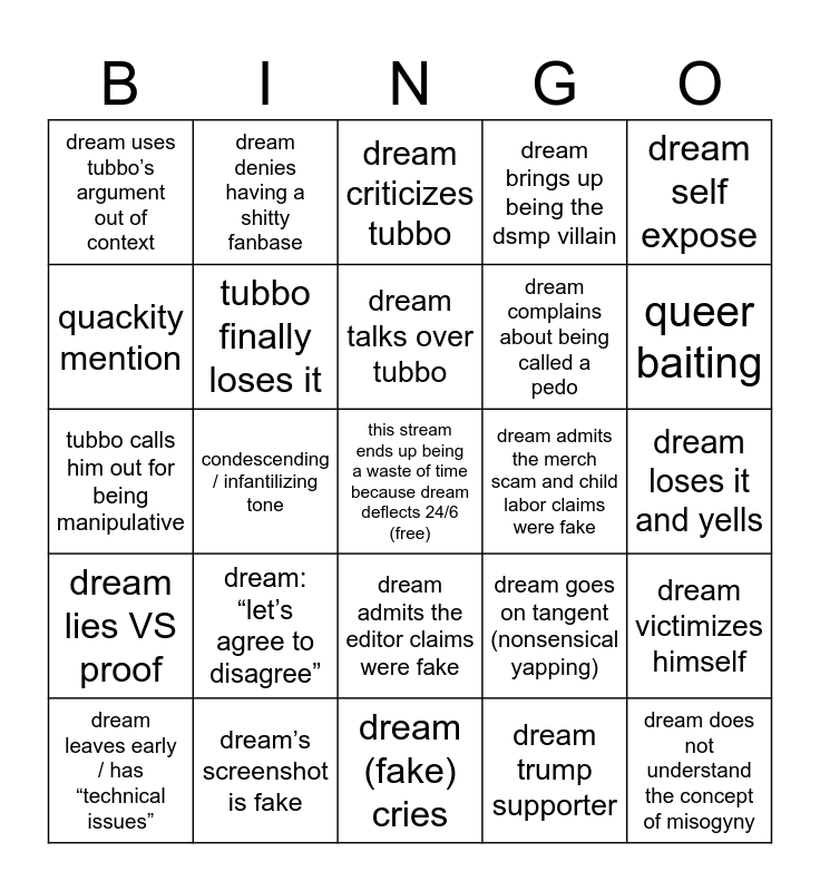 This bingo card has a free space and 24 words: dream: “let’s agree to disagree”, dream’s screenshot is fake, dream talks over tubbo, dream leaves early / has “technical issues”, dream self expose, dream uses tubbo’s argument out of context, quackity mention, dream denies having a shitty fanbase, dream admits the merch scam and child labor claims were fake, dream admits the editor claims were fake, dream complains about being called a pedo, tubbo calls him out for being manipulative, dream goes on tangent (nonsensical yapping), dream victimizes himself, tubbo finally loses it, dream trump supporter, dream loses it and yells, dream criticizes tubbo, queer baiting, condescending / infantilizing tone, dream does not understand the concept of misogyny, dream lies VS proof, dream brings up being the dsmp villain and dream (fake) cries.
