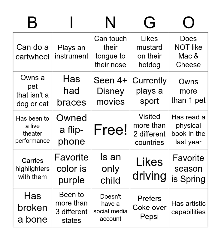 This bingo card has a free space and 24 words: Favorite color is purple, Been to more than 3 different states, Seen 4+ Disney movies, Has broken a bone, Does NOT like Mac & Cheese, Can do a cartwheel, Owns a pet that isn't a dog or cat, Plays an instrument, Visited more than 2 different countries, Is an only child, Currently plays a sport, Has been to a live theater performance, Likes driving, Favorite season is Spring, Has had braces, Prefers Coke over Pepsi, Has read a physical book in the last year, Can touch their tongue to their nose, Owns more than 1 pet, Owned a flip-phone, Has artistic capabilities, Carries highlighters with them, Likes mustard on their hotdog and Doesn't have a social media account.