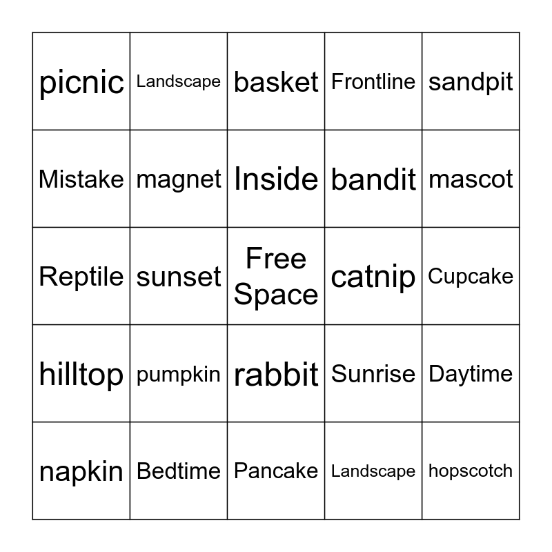 This bingo card has a free space and 29 words: napkin, pigpen, sunset, hotdog, picnic, basket, magnet, pumpkin, catnip, Bedtime, Cupcake, hopscotch, Pancake, Landscape, mascot, sidewalk, rabbit, hilltop, sandpit, Reptile, Sunrise, rocket, bandit, Mistake, Frontline, Landscape, Daytime, Inside and Flagpole.