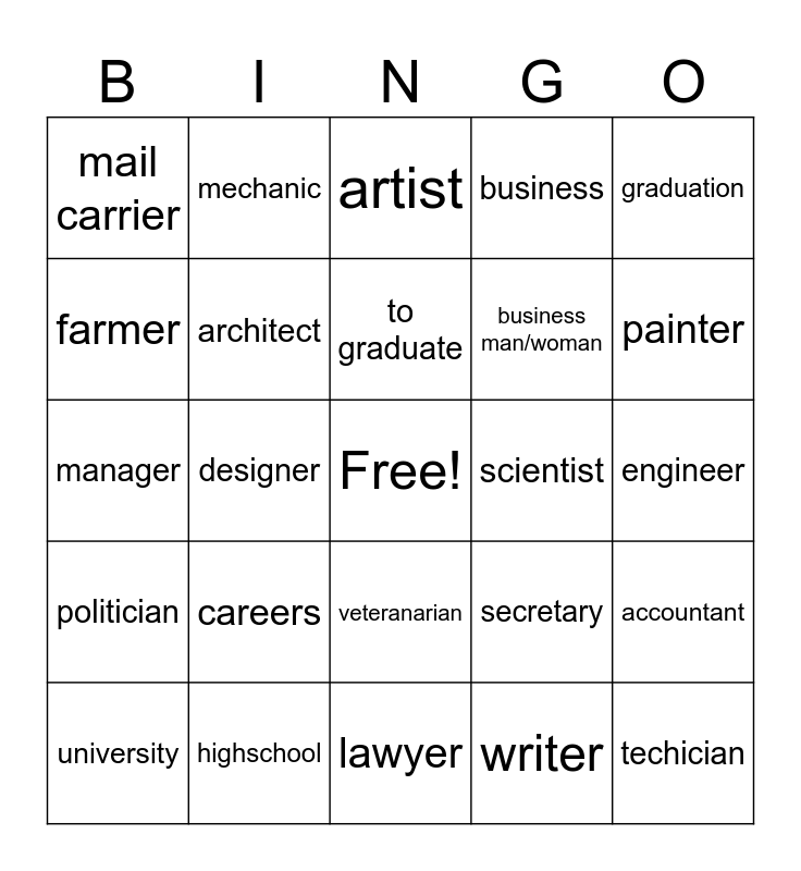 This bingo card has a free space and 24 words: careers, highschool, to graduate, university, graduation, mail carrier, farmer, mechanic, scientist, veteranarian, business man/woman, manager, secretary, accountant, architect, writer, engineer, artist, painter, designer, techician, politician, business and lawyer.