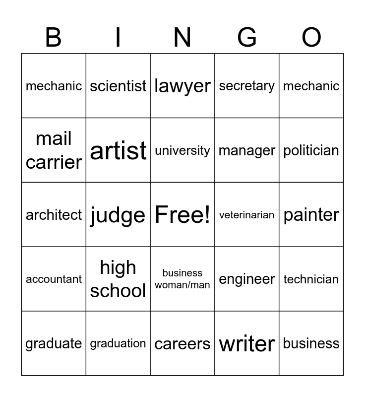 This bingo card has a free space and 24 words: high school, graduation, university, graduate, mechanic, mechanic, mail carrier, scientist, veterinarian, business woman/man, manager, architect, engineer, technician, artist, writer, painter, lawyer, politician, judge, business, accountant, secretary and careers.